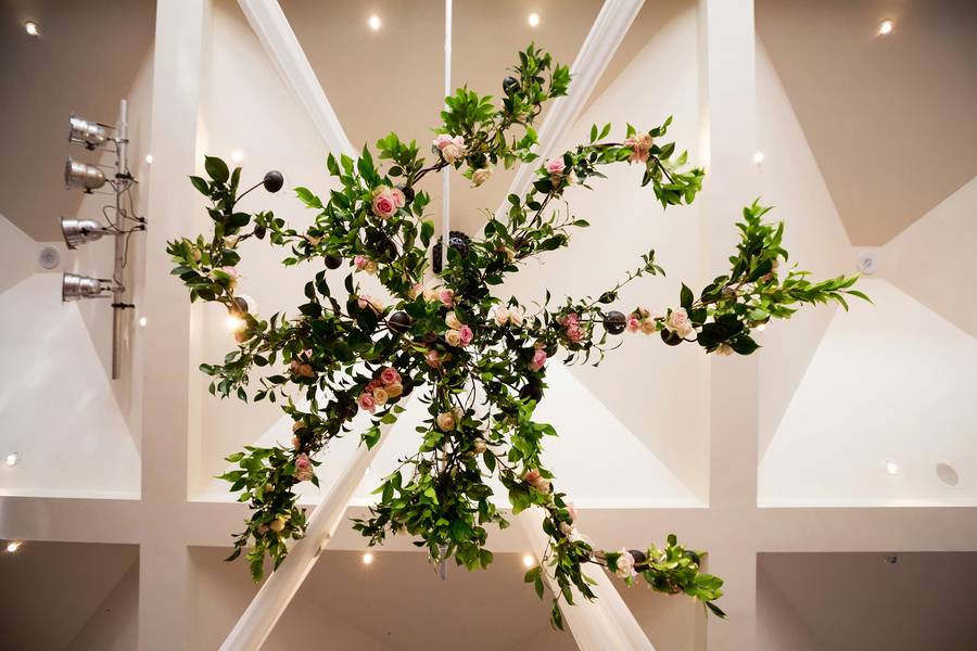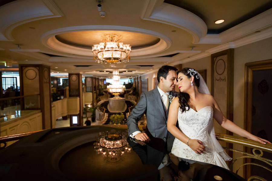 Irina’s amazing veil was perfect for this flying veil shot in front of the green vines at Victoria Barracks. Our next location was the Langham hotel in the heart of Southbank, Melbourne. I used flash to create a striking composition of Irina and Jacob on the grand staircase, whilst Noble Films captured the couple embracing on film. A few photographs later, we headed to Leonda by the Yarra, a beautiful location where Irina and Jacob were to have their wedding reception. The couple were very impressed with the beautifully decorated room, with lots of flowers and an amazing rose garden centrepiece hanging from the ceiling above the dancefloor. Our videographers filmed the couple practicing their first dance, as I photographed the floral details that were perfectly complemented by the vast windows looking out over the tree-lined Melbourne Yarra River, matching the garden wedding theme.